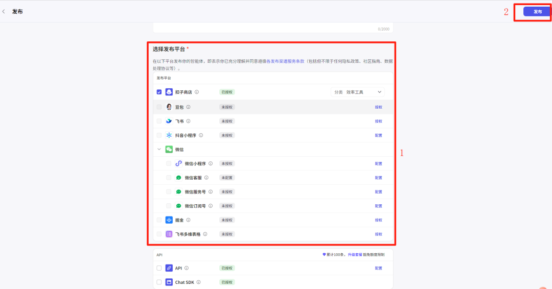 - 在AI Agent 的编排页面右上角,单击发布会跳转到下图。