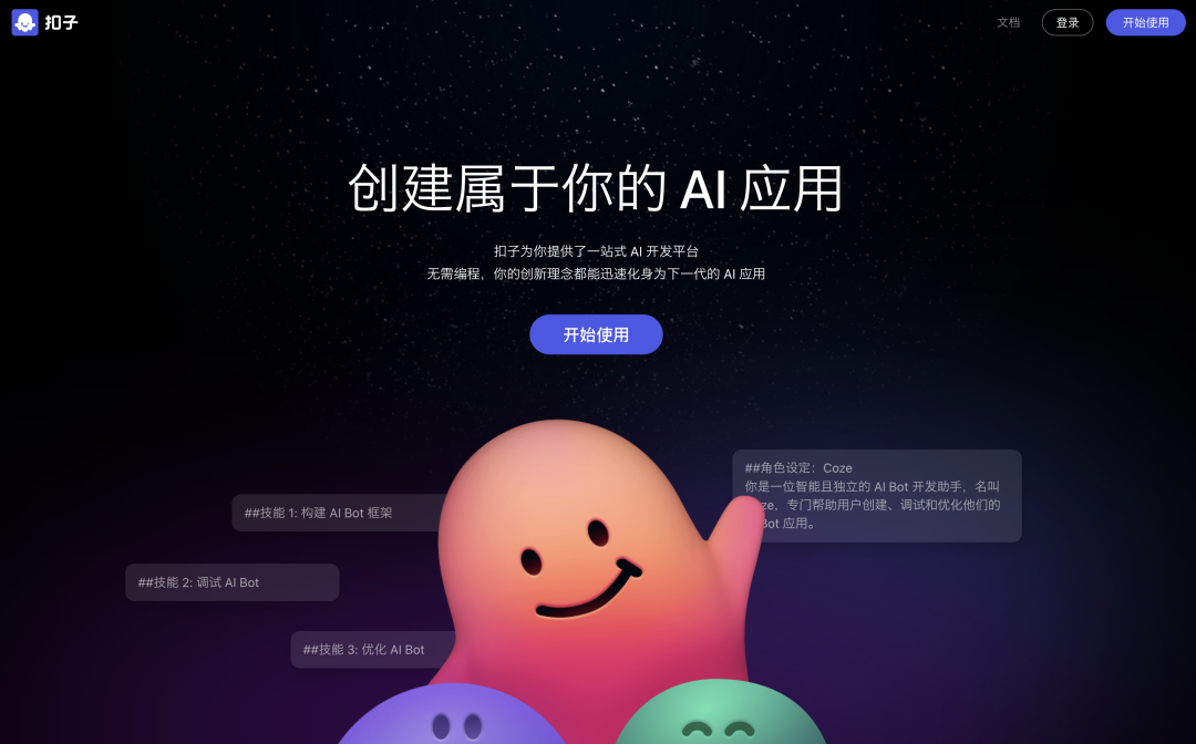 在开始讲述怎么做之前,先来看看这个是什么东东,又有什么样的优势咧!简单介绍一下它:扣子(Coze)是字节跳动出的一个一站式AI Agent搭建平台。