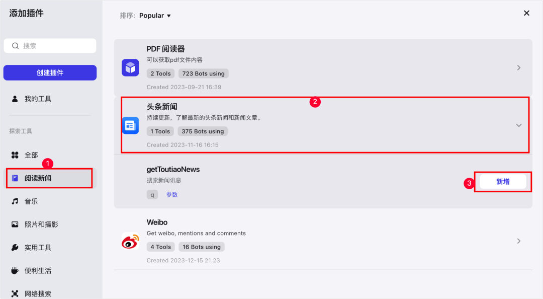 - 在添加插件页面,选择 阅读新闻 > 头条新闻 > getToutiaoNews,然后单击新增。