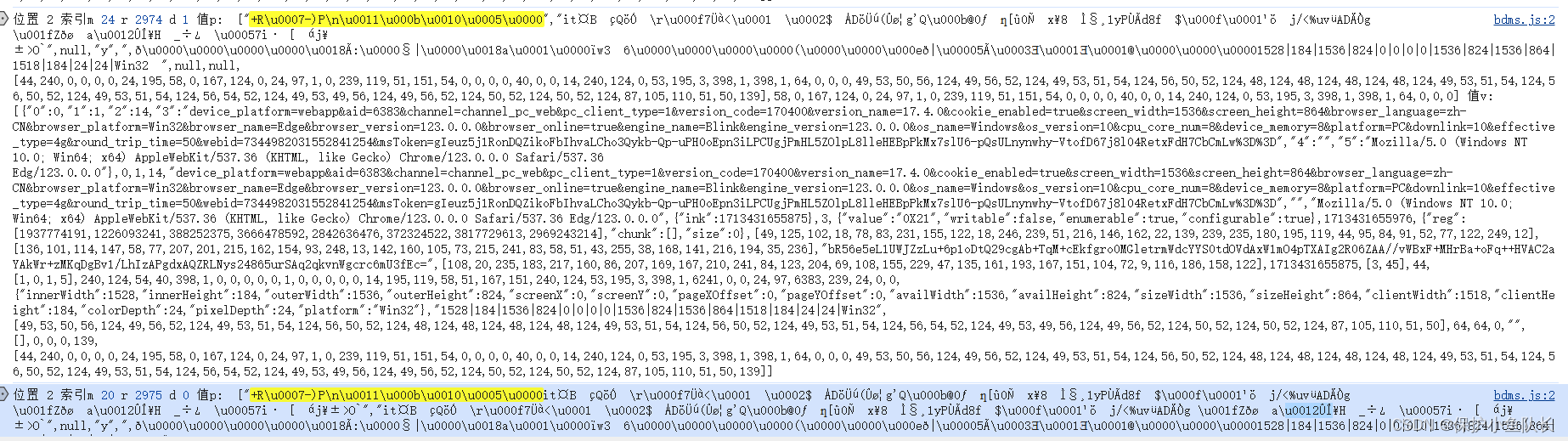 这里我们的a_bogus的值就出来了,并且这里有一串乱码,我们搞过xb的都知道最终值是传入这串乱码然后通过魔改的base64算法生成的,这里就不多赘述了