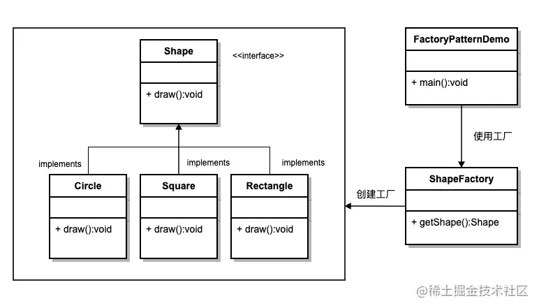 FactoryPatternDemo,我们的演示类使用 ShapeFactory 来获取 Shape 对象。它将向 ShapeFactory 传递信息(CIRCLE / RECTANGLE / SQUARE),以便获取它所需对象的类型。