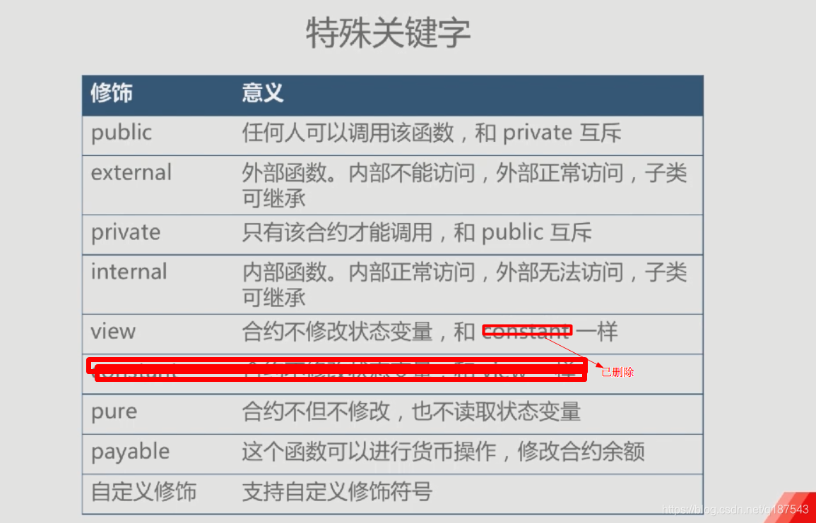 - external 与public 类似,用于接口。只不过这些函数只能在合约之外调用 - 它们不能被合约内的其他函数调用。