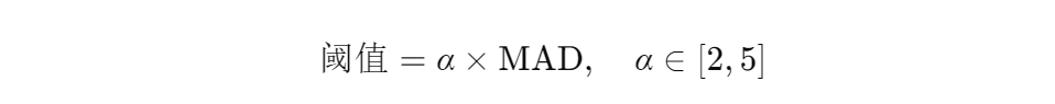基于MAD的检测:计算观测值与中位数的绝对偏差,若偏差超过3倍MAD则判定为异常值。MAD公式为: