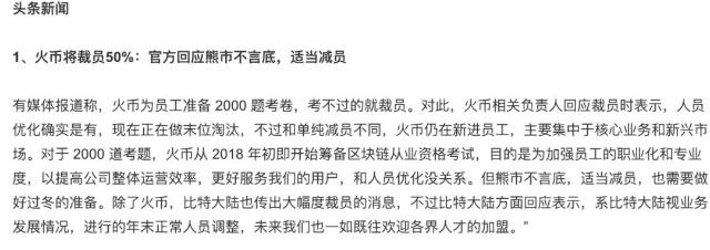 火币官方回应与比特大陆如出一辙:人员优化,末位淘汰。