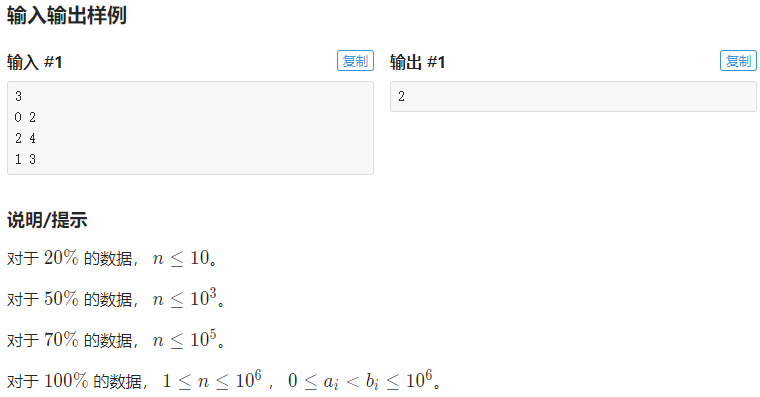 n个比赛 [开始时间,结束时间] 问一个人最多能参加几个(不能同时参加两个且必须有始有终)