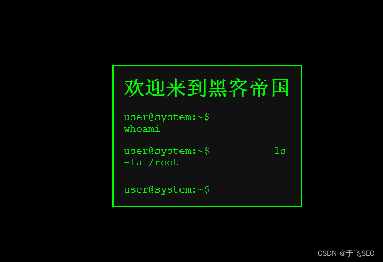 模仿电影中黑客电脑界面,html装逼代码 请记住,这个界面只是一个视觉效果,没有任何实际的黑客功能。此外,真正的黑客工作涉及到复杂的技术知识,并且应该始终遵守法律和道德标准。创建一个模仿电影中黑客电脑界面的HTML代码可以是一个有趣的小项目,但请记住,这只是一种视觉效果,不涉及任何实际的黑客活动。元素来模拟更多的命令和输出,或者使用JavaScript来动态生成命令输出,使其看起来更真实。这段代码创建了一个带有绿色文字和黑色背景的终端界面,看起来像是电影中的黑客电脑界面。类表示光标,它使用CSS动画来模拟闪烁效果。