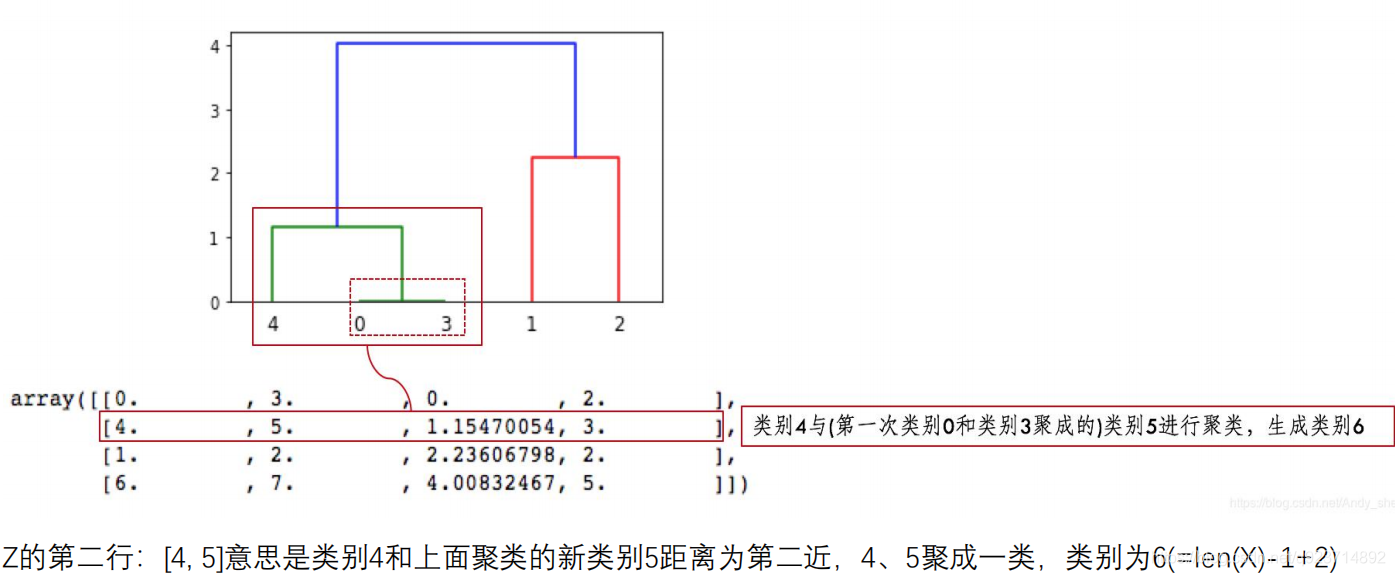 (3)当criterion为’maxclust’时,t代表了最大的聚类的个数,设置4则最大聚类数量为4类,当聚类满足4类的时候,迭代停止