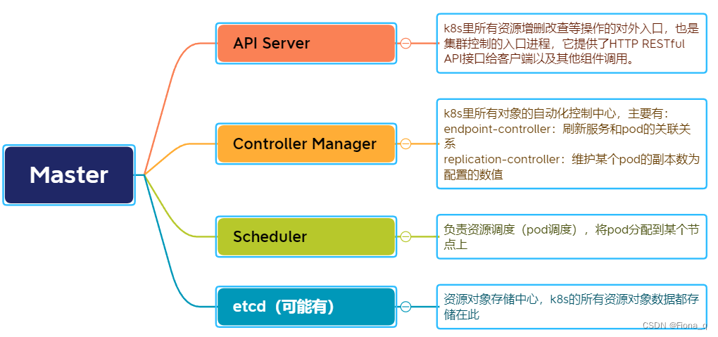 一般来说,k8s的所有控制命令都是发送给master,然后由master来负责具体的执行过程。master通常会部署在一个独立的服务器或虚拟机上,它是整个集群的首脑,如果master宕机或不可用,那么所有的控制命令都将失效。