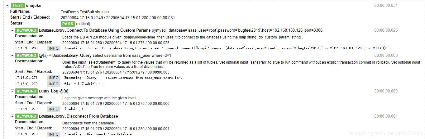 1)数据库连接如图database='saas',user='root',password='bugfeel2019',host='192.168.180.126',port=3306