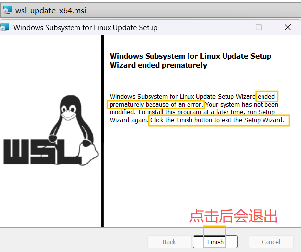 但安装时,似乎有报错提示 (暂且点击"Finish"退出)