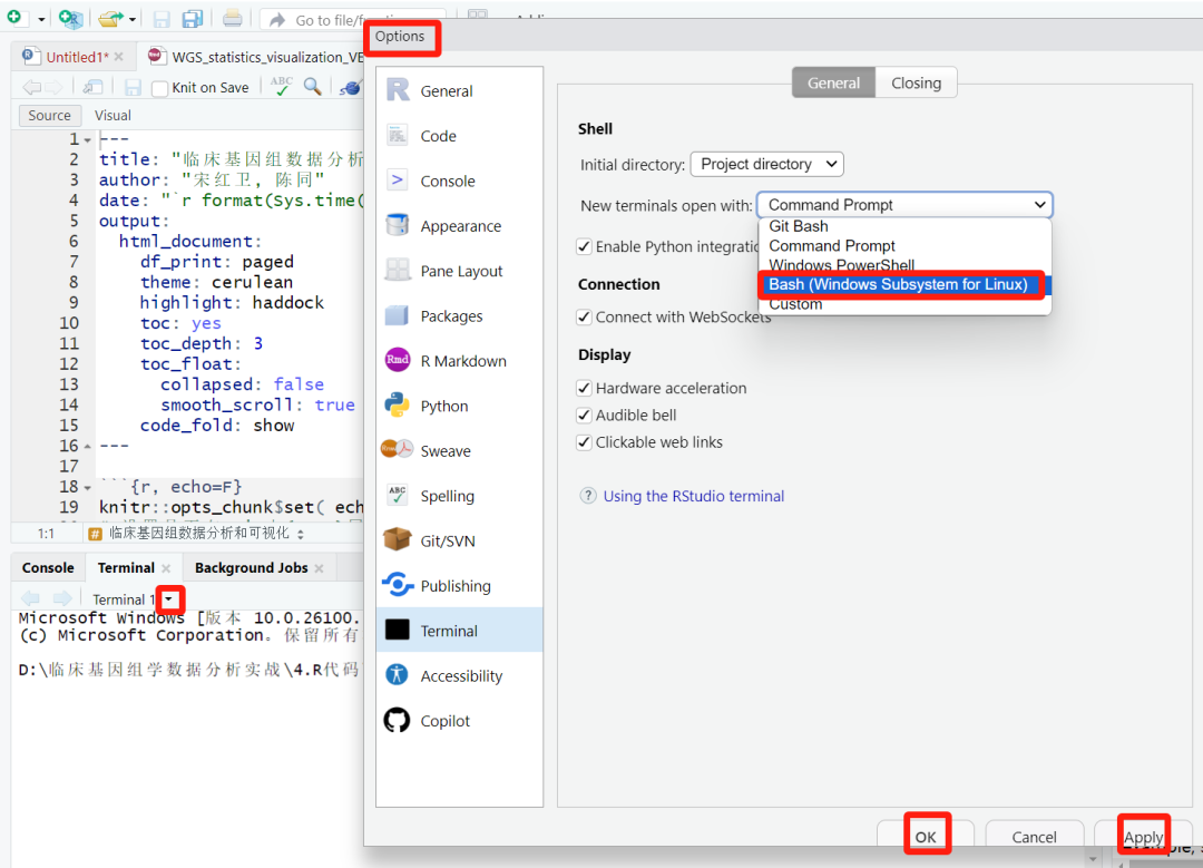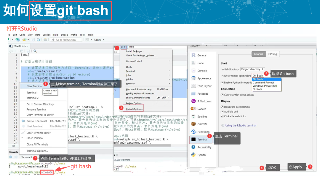 如果已经安装了R和RStudio,可设置RStudio的终端 (Terminal)使用git bash: