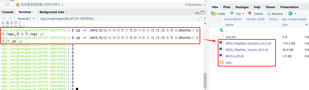 cp -r /mnt/d/临床基因组学数据分析实战/3.服务器及Ubuntu子系统/wgs_服务器/wgs ~/cp -r /mnt/d/临床基因组学数据分析实战/3.服务器及Ubuntu子系统/*.sh ~/