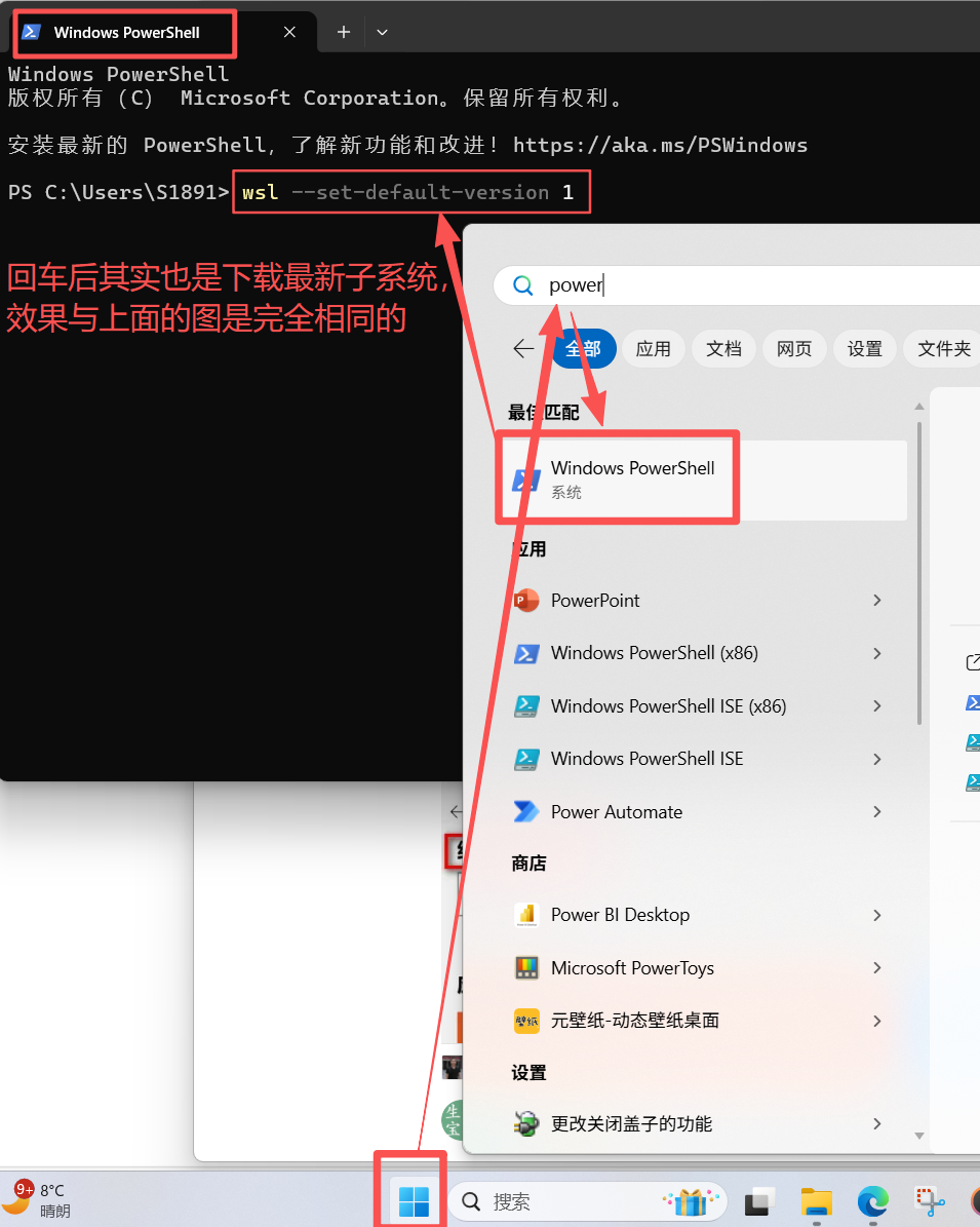 Win11在 PowerShell 中运行: wsl --set-default-version 1