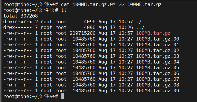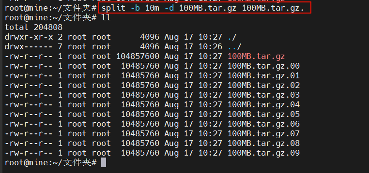 - 100MB.tar.gz. :指定分片后的包命名前缀,后缀为数字递增