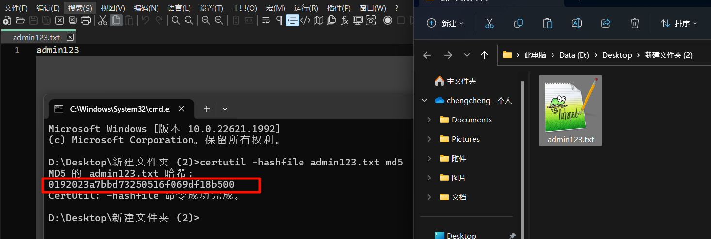 - Windows计算纯文本的MD5值需要将文本内容写入文件内,计算文件的MD5值得出文本的值