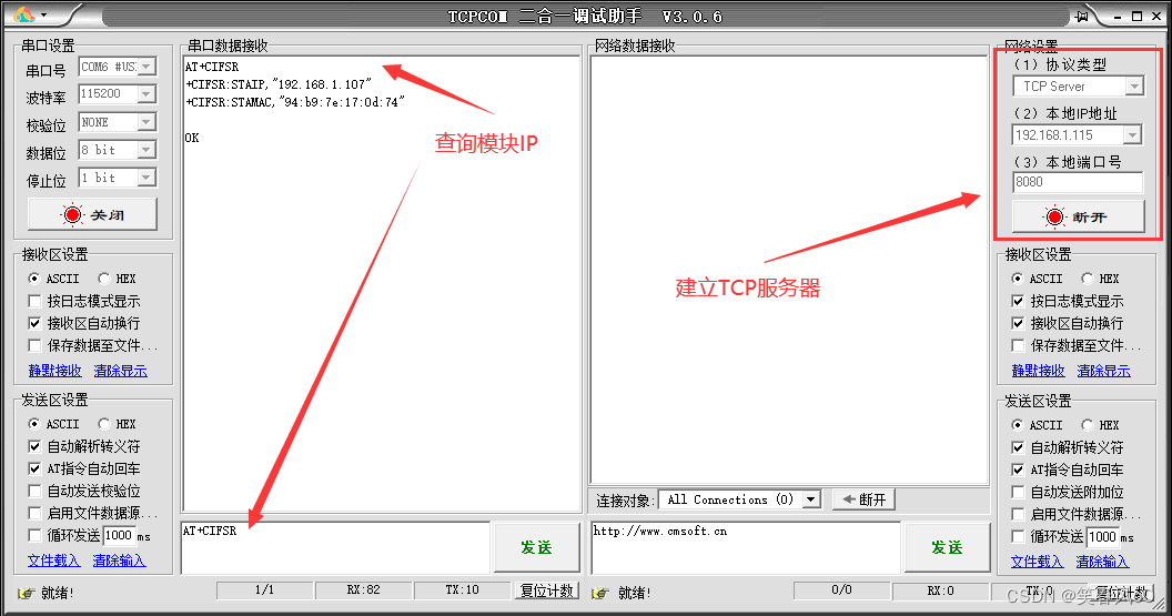 连接好之后,打开串口软件和网络调试助手,可以使用二合一软件: