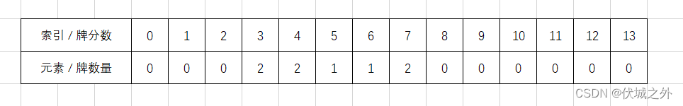 由于K牌面分数是13,因此我们只需要定义card_count数组长度为14即可,题目用例可得数组如下: