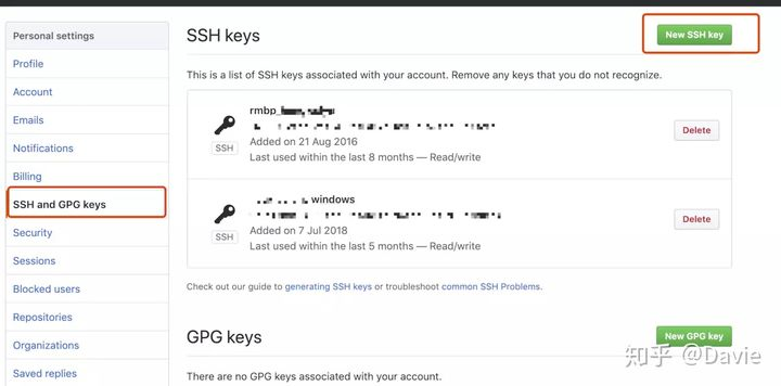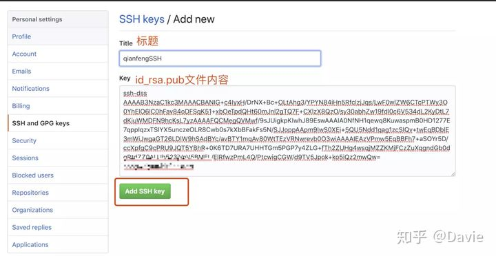 - 2、打开已经登录的github,打开setting -> SSH Keys,点击右上角New SSH Key,把第一步生成的两个文件中的其中一个id_rsa.pub内容放入到输入框中,并为该ssh key命名。