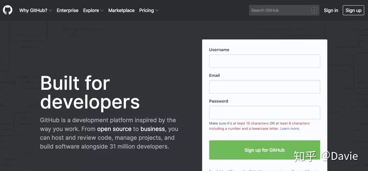 GitHub是一个面向开源及私有软件项目的托管平台,因为只支持Git作为唯一的版本库格式进行托管,故名GitHub。Github可以为开发者提供项目代码托管服务,目前已经是最大的开源软件平台之一。2018年6月,微软收购了Github。 本系列课程内容,我们将使用github作为我们项目代码的托管平台。因此,首先,我们需要注册github账号。 Github地址:github.com/