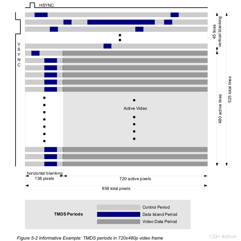 例如720*480分辨率图像,实际传输的是858*525,其他时间都是处于行、列消隐期,其中包括音频数据、控制数据等。
