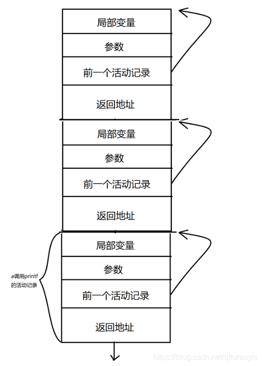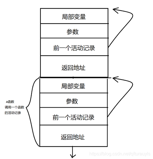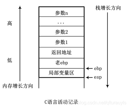 活动记录,就是在程序执行的过程中函数调用时栈上的内容变化。一个函数被调用,反映在栈上的与之相关的内容被称为一帧,其中包含了参数、返回地址、老ebp值、局部变量以及esp和ebp。