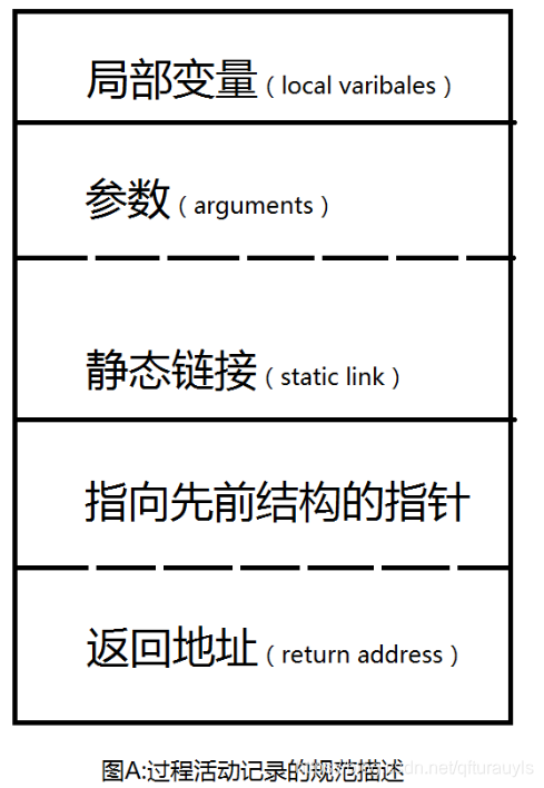 当每个函数被调用时,都会产生一个过程记录(或者类似的结构)。过程活动记录是一种数据结构,用于支持过程调用,并记录调用结束以后返回调用点所需要的全部信息。