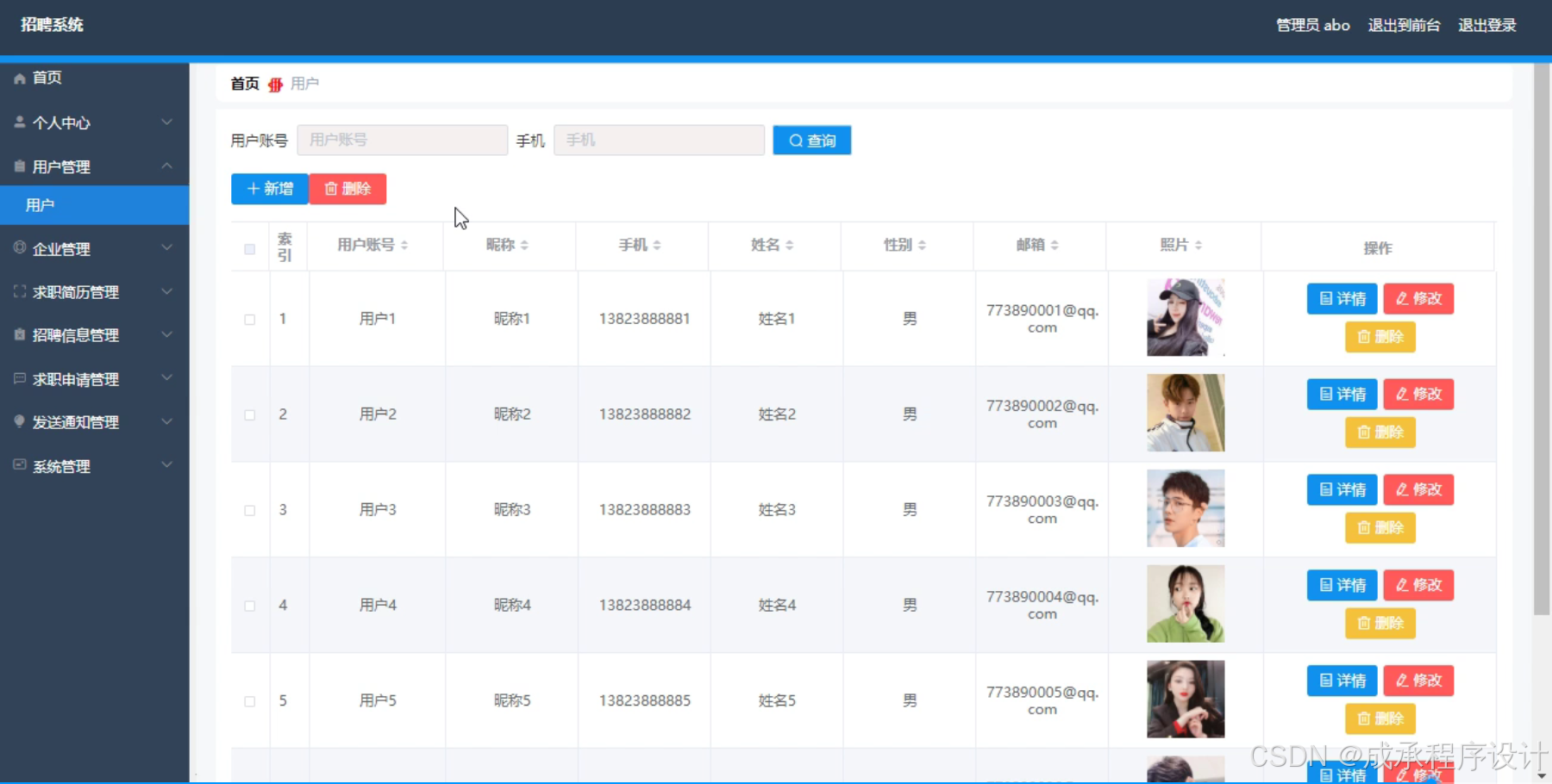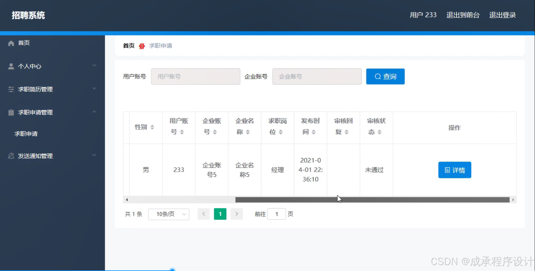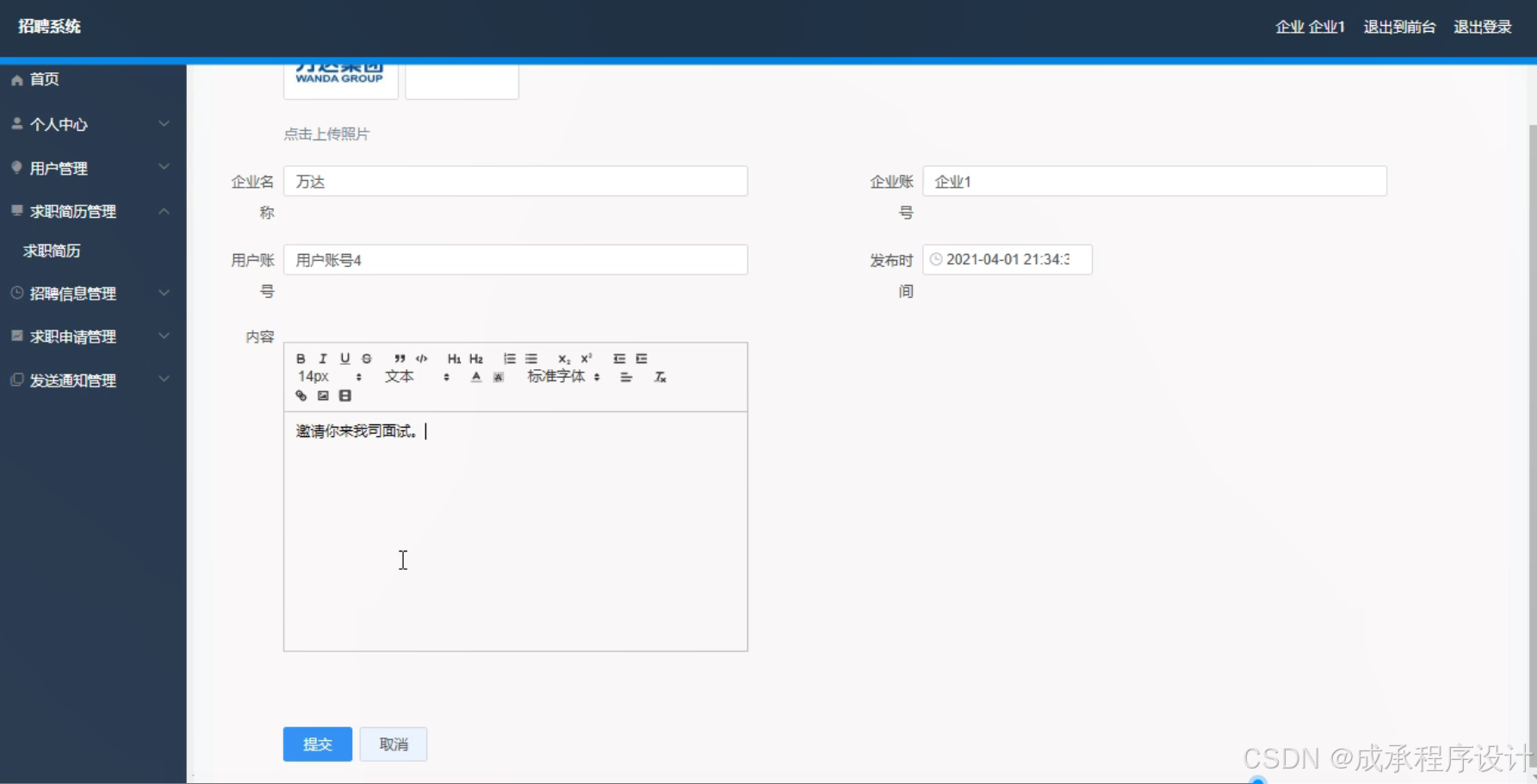 - 开发出一个具备用户管理、求职简历管理、招聘信息管理、求职申请管理、发送通知等功能的招聘系统。该系统能够满足企业和求职者的基本需求,提高招聘和求职的效率。