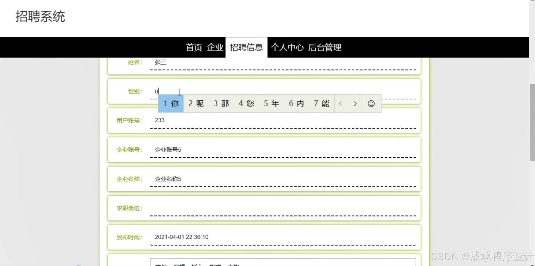 - 在招聘系统中,部分企业可能发布虚假的招聘信息,或者求职者可能提供虚假的简历内容。这不仅影响招聘的公平性,也会给双方带来不必要的麻烦。需要建立有效的信息审核机制来确保信息的真实性。