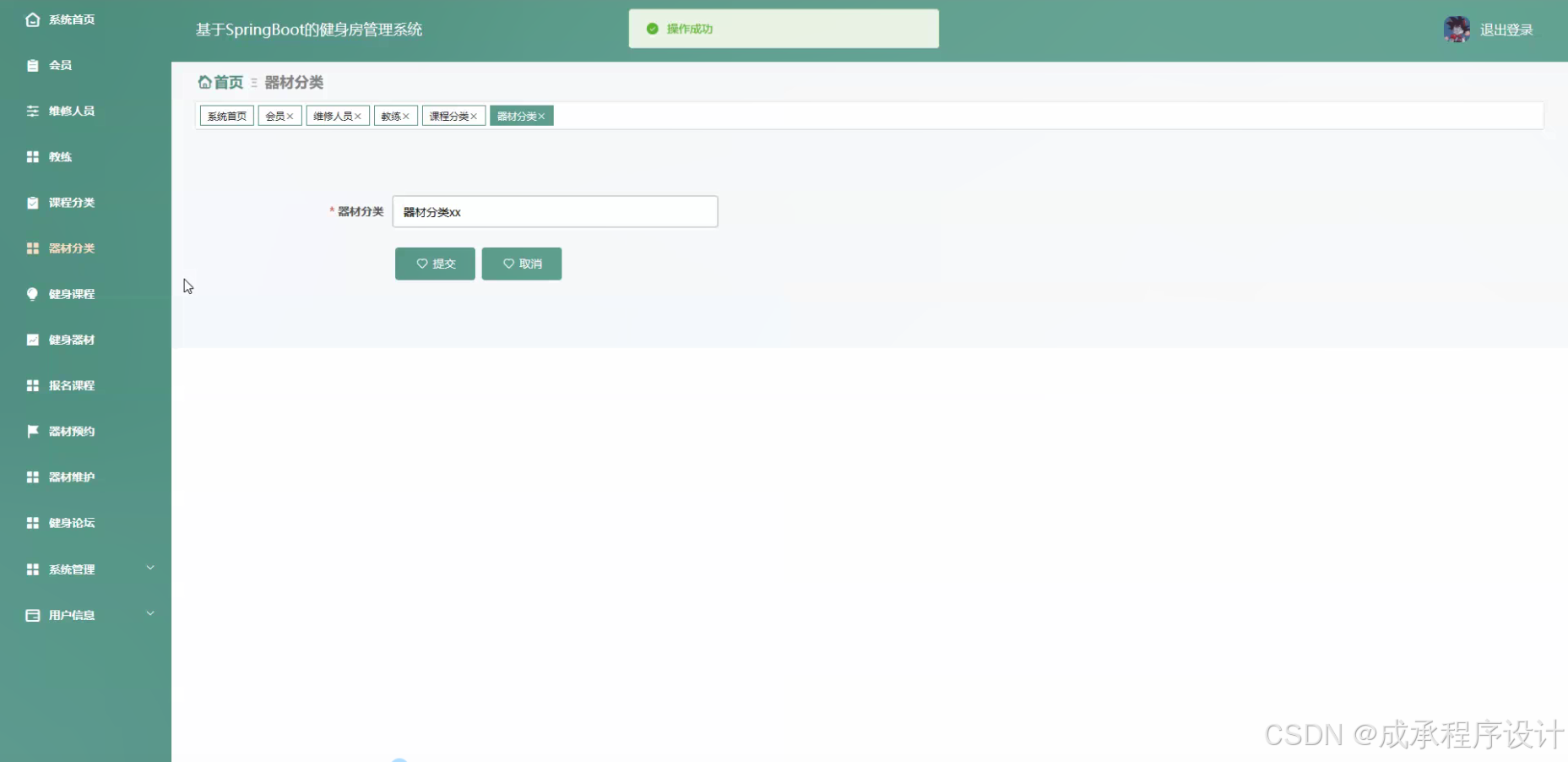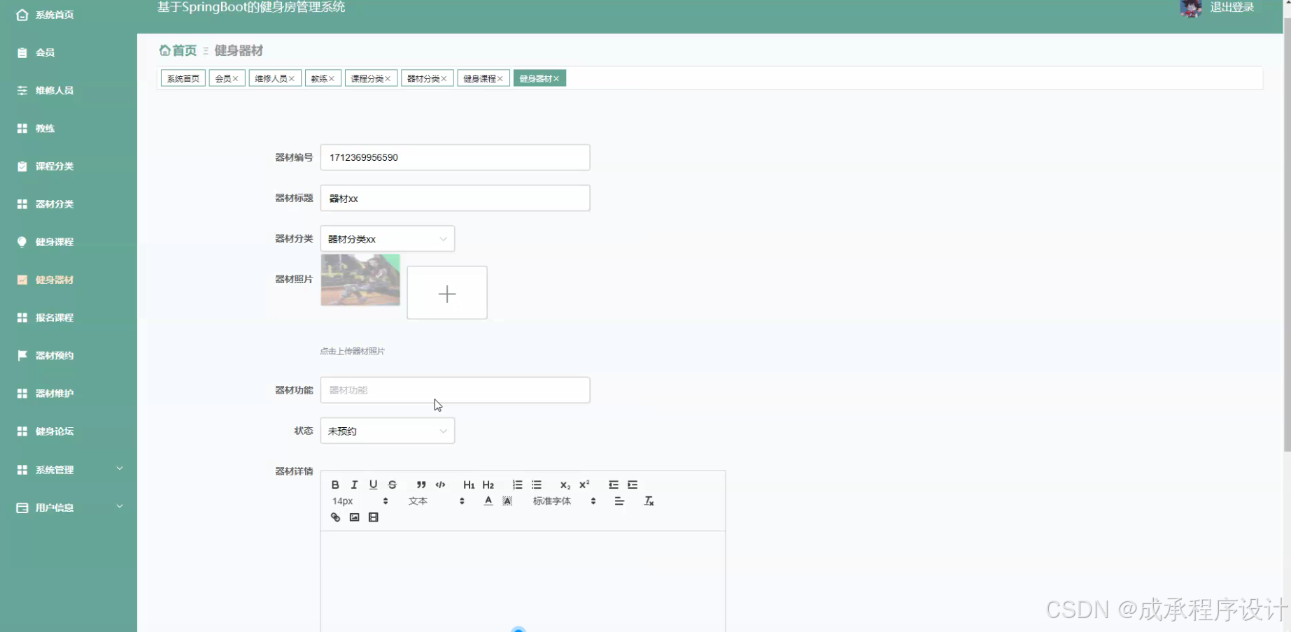 - 器材分类管理,将健身器材按照功能、使用方式等进行分类,例如力量训练器材、有氧器材等。
