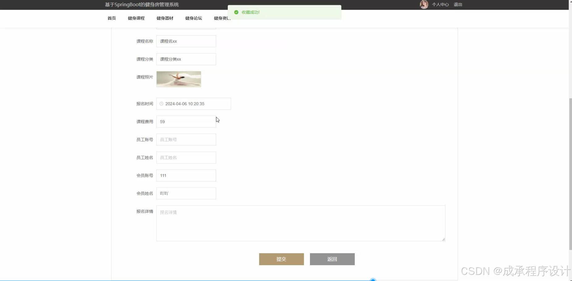 - 按照系统设计的要求,进行各个功能模块的开发。例如,开发会员管理模块、课程管理模块、器材管理模块等。