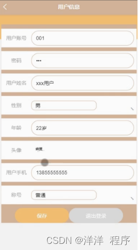 用户信息,在用户信息页面通过填写用户账号、密码、用户姓名、性别、年龄、头像、用户手机、称号等详细信息进行保存或退出登录操作,如图5-6所示。