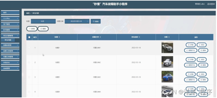 常见问题管理,在常见问题管理页面可以对索引、标题、问题分类、发布时间、封面等内容进行详情,修改,查看评论和删除操作,如图5-11所示。
