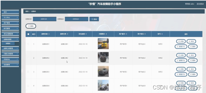 故障库管理,在故障库管理页面可以对索引、故障名称、故障分类、发布时间、封面图片、用户账号、用户姓名、称号等内容进行详情,修改,查看评论和删除操作,如图5-12所示。