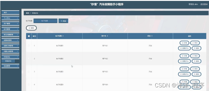 交流论坛,在交流论坛页面可以对索引、帖子标题、用户名、状态等内容进行详情,修改,查看评论和删除操作,如图5-13所示。