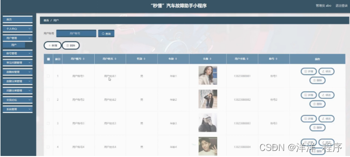 用户管理,在用户管理页面可以对索引、用户账号、用户姓名、性别、年龄、头像、用户手机、称号等内容进行详情,修改和删除操作,如图5-9所示。