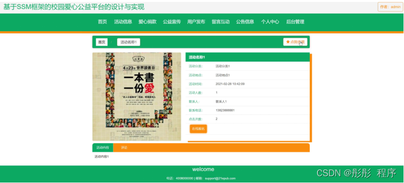 活动信息,在活动信息页面可以查看活动名称、活动分类、活动地点、活动时间、图片、活动人数、联系人、联系电话、点击次数、活动内容等信息进行在线报名、评论或收藏操作,如图5-2所示。