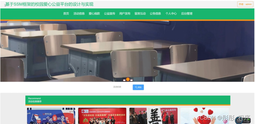 校园爱心公益平台系统,在系统首页可以查看首页、活动信息、爱心捐款、公益宣传、用户发布、留言互动、公告信息、个人中心、后台管理等内容,如图5-1所示。