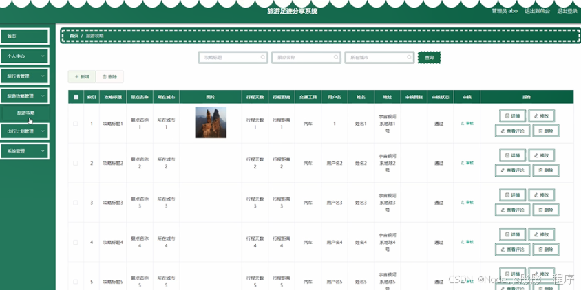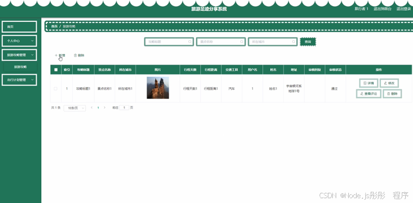 旅游攻略,在旅游攻略页面通过填写旅游标题、景点名称、所在城市、图片、行程天数、行程距离、交通工具、旅行者名、姓名、地址、审核状态、审核等内容,并可进行详情,修改,查看评论删除等操作。如图5-7所示。