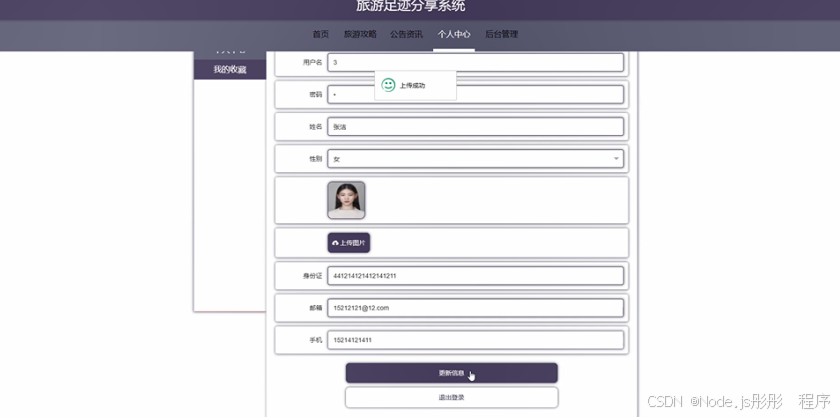 个人中心管理:用户可以查看和修改个人信息,包括用户名、密码、性别、头像、身份证、邮箱和手机号码等。