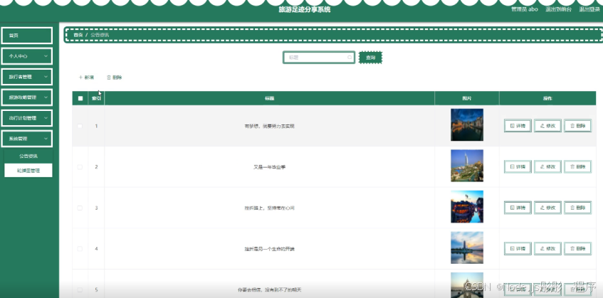 系统管理:管理员可以管理公告资讯、轮播图等内容,包括详情、修改和删除操作。