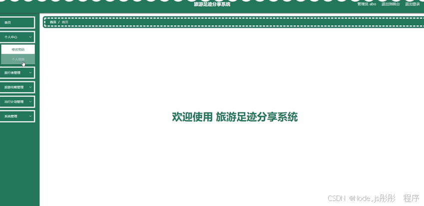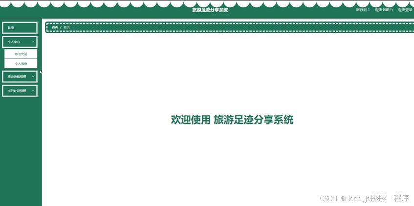 旅行者登录进入系统可以对主页、个人中心、旅游攻略管理、出行者管理等功能进行相应操作,如图5-9所示。