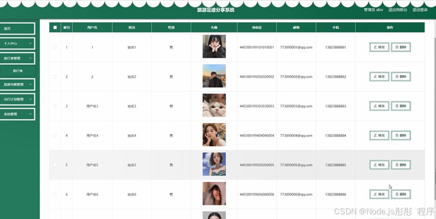 旅游者管理:管理员可以查看、修改和删除旅行者信息,包括旅行者名、姓名、性别、头像、身份证、邮件和手机等。