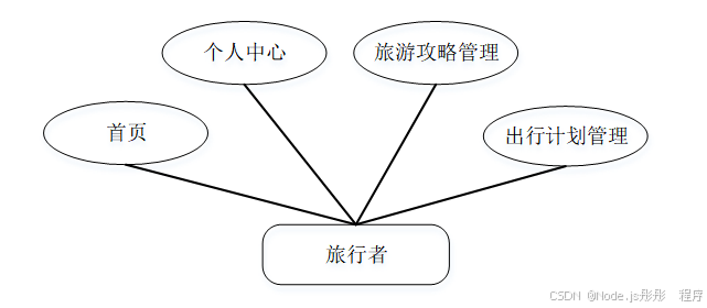 旅行者管理登陆后,主要模块包括首页,个人中心,旅游攻略管理,出行计划管理等功能。旅行者用例图如图3-2所示。
