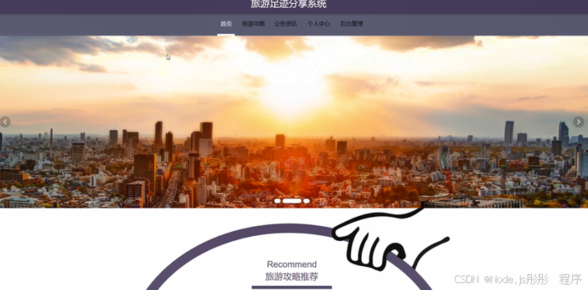 旅游足迹分享系统,在系统首页可以查看首页、旅游攻略、公告资讯、个人中心、后台管理等内容,并进行详细操作;如图5-1所示。