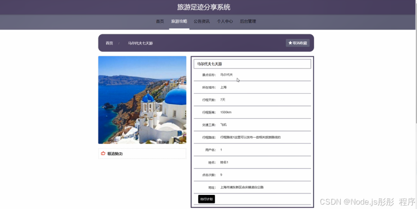 旅游攻略管理:用户可以发布、查看、修改和删除旅游攻略,攻略内容包括标题、景点名称、所在城市、行程天数、行程距离、交通工具、行程路线、攻略详情等。