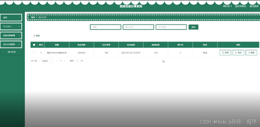 出行计划管理,在出行计划管理页面可以对标题,景点名称,出行类型,发布时间,时间安排,旅行者名,姓名等内容进行详情、修改和删除操作,如图5-12所示。