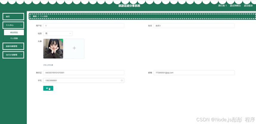 个人中心,在个人中心页面通过填写旅行者名,姓名,性别,头像,身份证,邮件,手机等内容并提交进行个人信息修改操作,如图5-10所示。