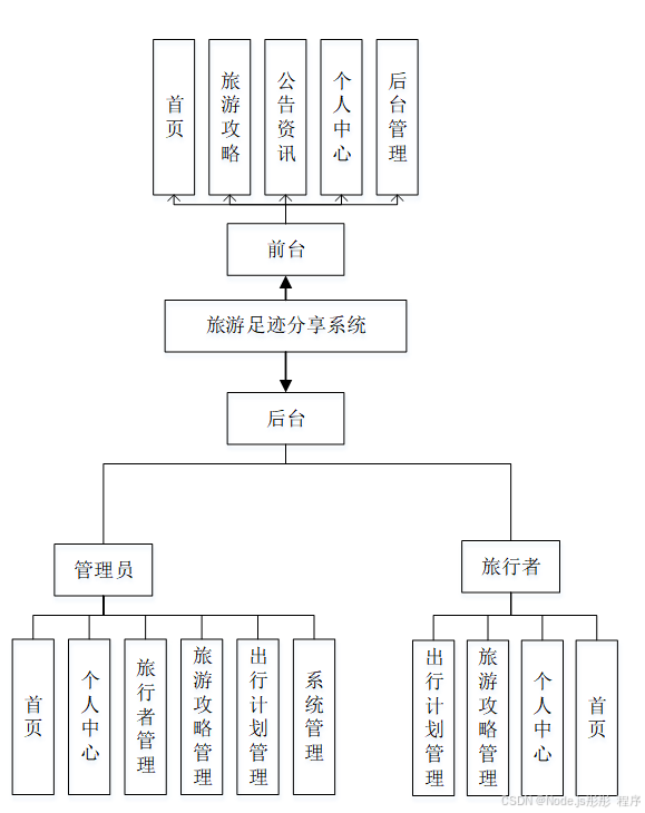 系统设计是把本系统的各项功能需求进行细化,而转换为软件系统表示的一个设计过程,在对目标系统的研究分析之后,做出整个系统平台的总体规划,进而对用例中各个对象进一步地合理精细设计。为降低整个系统的复杂度,而使其更加便于修改,提高代码的可读性,我们会将系统模块化,模块间保持相对独立,且每个模块只完成一个子功能,并且与其他模块通过简单的接口链接,即高内聚低耦合原则,而使整个系统能够拥有一个高性能的结构,这边是系统概要设计最重要的目的。在之前的需求分析的基础上,本旅游足迹分享系统结构,如下图4-1所示。