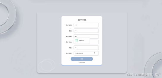 用户注册,在注册页面填写用户账号、用户姓名、密码、确认密码、电话号码、年龄等详细信息进行注册,如图5-9所示。