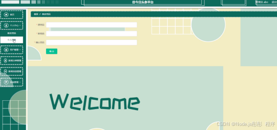 管理员密码修改功能:每一个新的管理员都可以修改密码,在这里修改密码时有一定的限制要求,原密码正确,新密码以及确认新密码输入的内容必须一致,点击确认方可完成修改。二者有其一不满足要求,则修改失败。在这里新密码和确认密码都是使用的掩码,对于密码修改,目的在于,如果更换管理员时,管理员可以将密码进行修改,以保证后台的安全性,也确保系统的安全性,如图5-3所示: